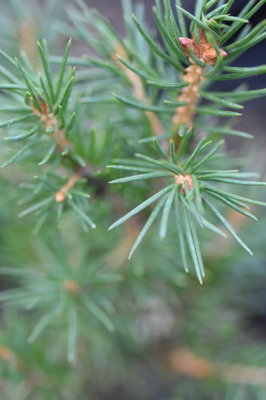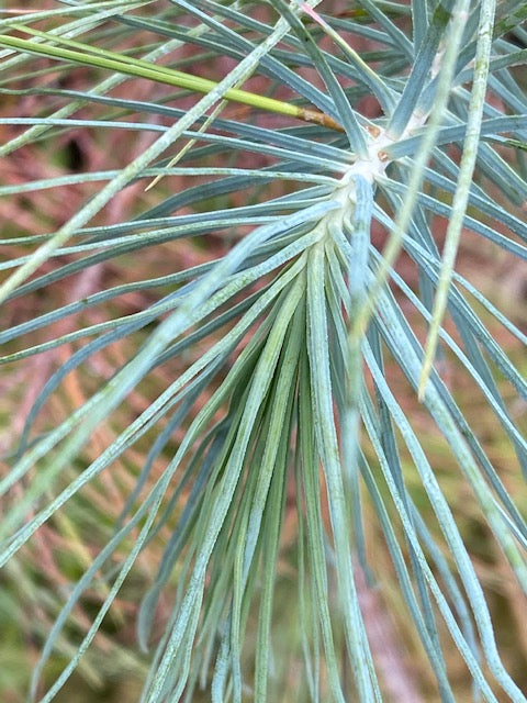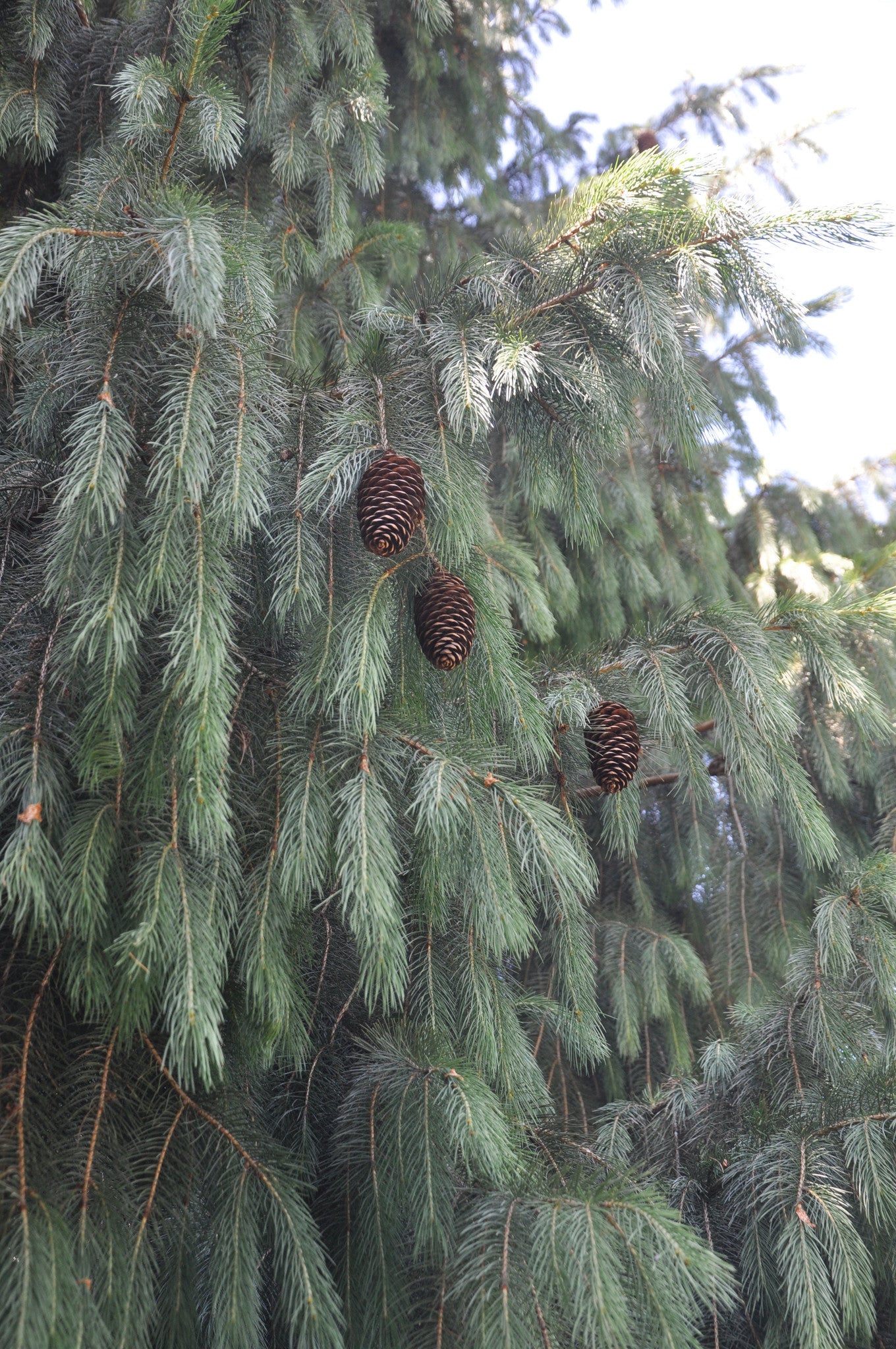 Attributes: Evergreen. Curved blue green needles. Cones formed at the branch tips.