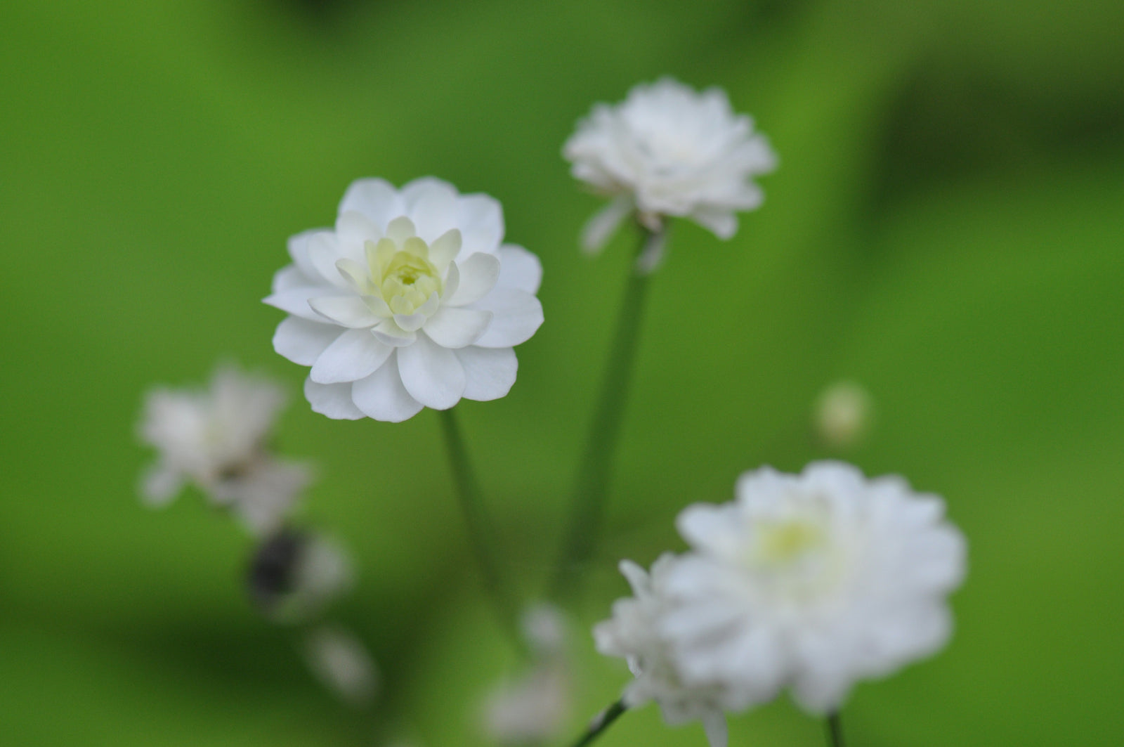 Attributes: Deciduous. Tall wispy stems above deep green palmately lobed foliage. Numerous, bright yellow double flowers with a bit of green in the center.