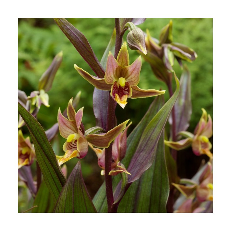 Attributes: Deciduous. Clumping. Blooms in spring and summer. Tall flower spikes of numerous Yellow-green, purple-red lip and petals. Dark purple foliage