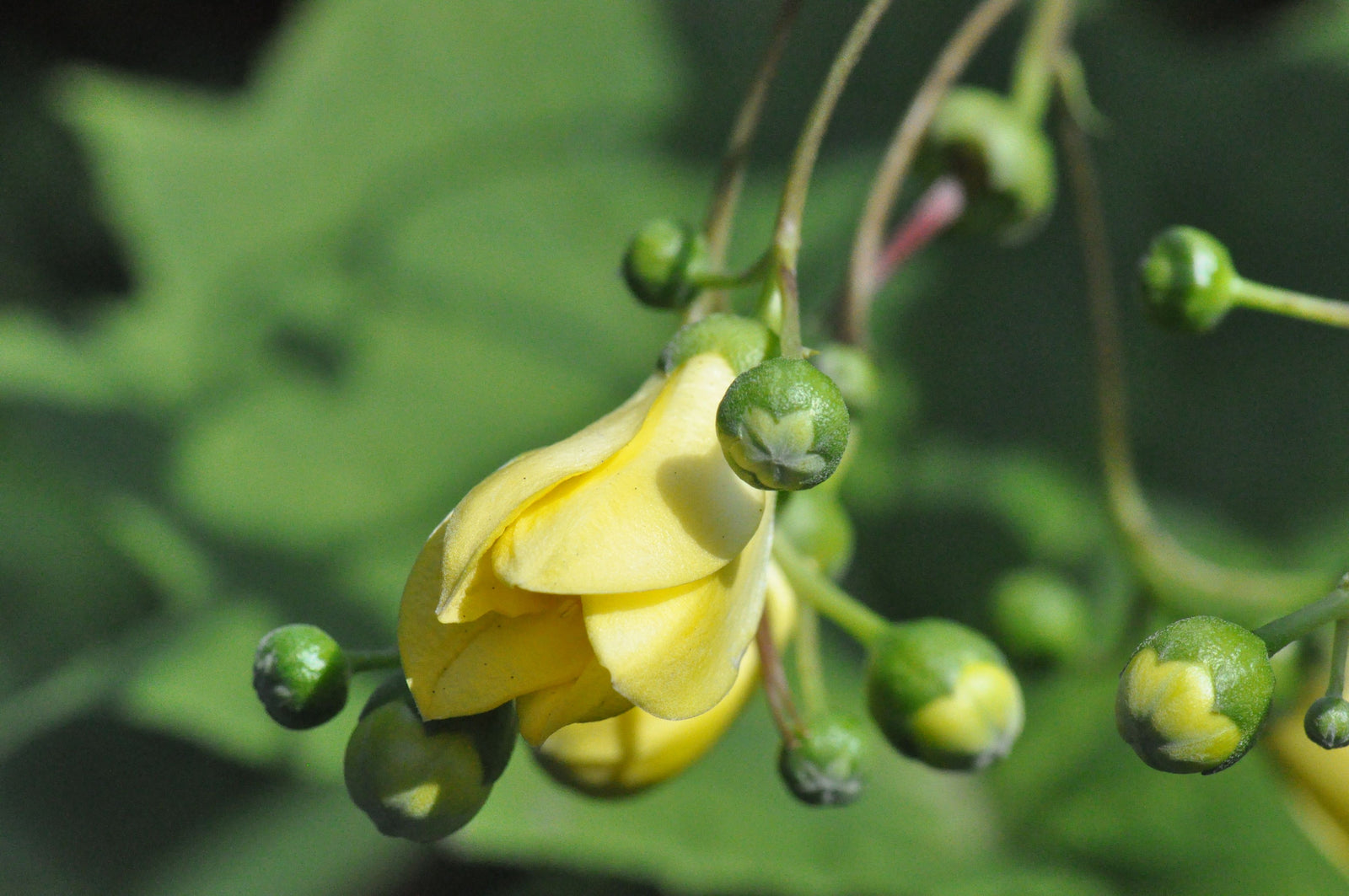 Attributes: Deciduous, 3' tall. Maple like leaves, with yellow, thick, waxy bell shaped blooms in mid to late summer. The new unopened buds sparkle.