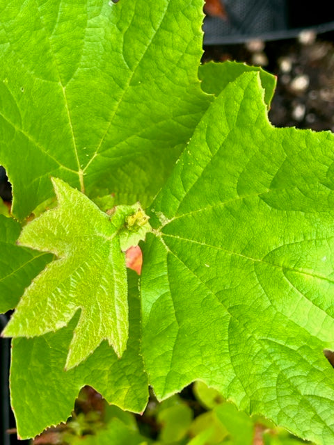 Attributes: Deciduous, large, thick leaves that emerge rich red. Upright flowers.