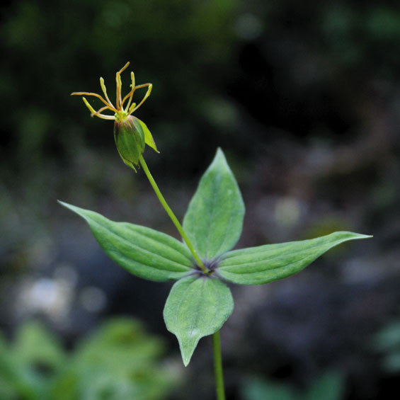 Attributes: Deciduous, 16" tall. Clumping. Branching, slender rhizome. Four or sometimes more leaves in opposite pairs topped by whorled flowers. Green outer tepal and slender inner tepal.