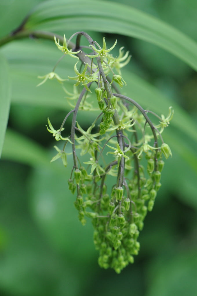Attributes: Deciduous, Large, robust rhizomes, arching stems with elliptic foliage, panicles of star shaped green flowers in spring. Orange fruit in late summer, fall.