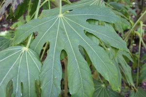 Attributes: Evergreen. Deeply lobbed palmate foliage. White flowers during winter. Black fruit.
