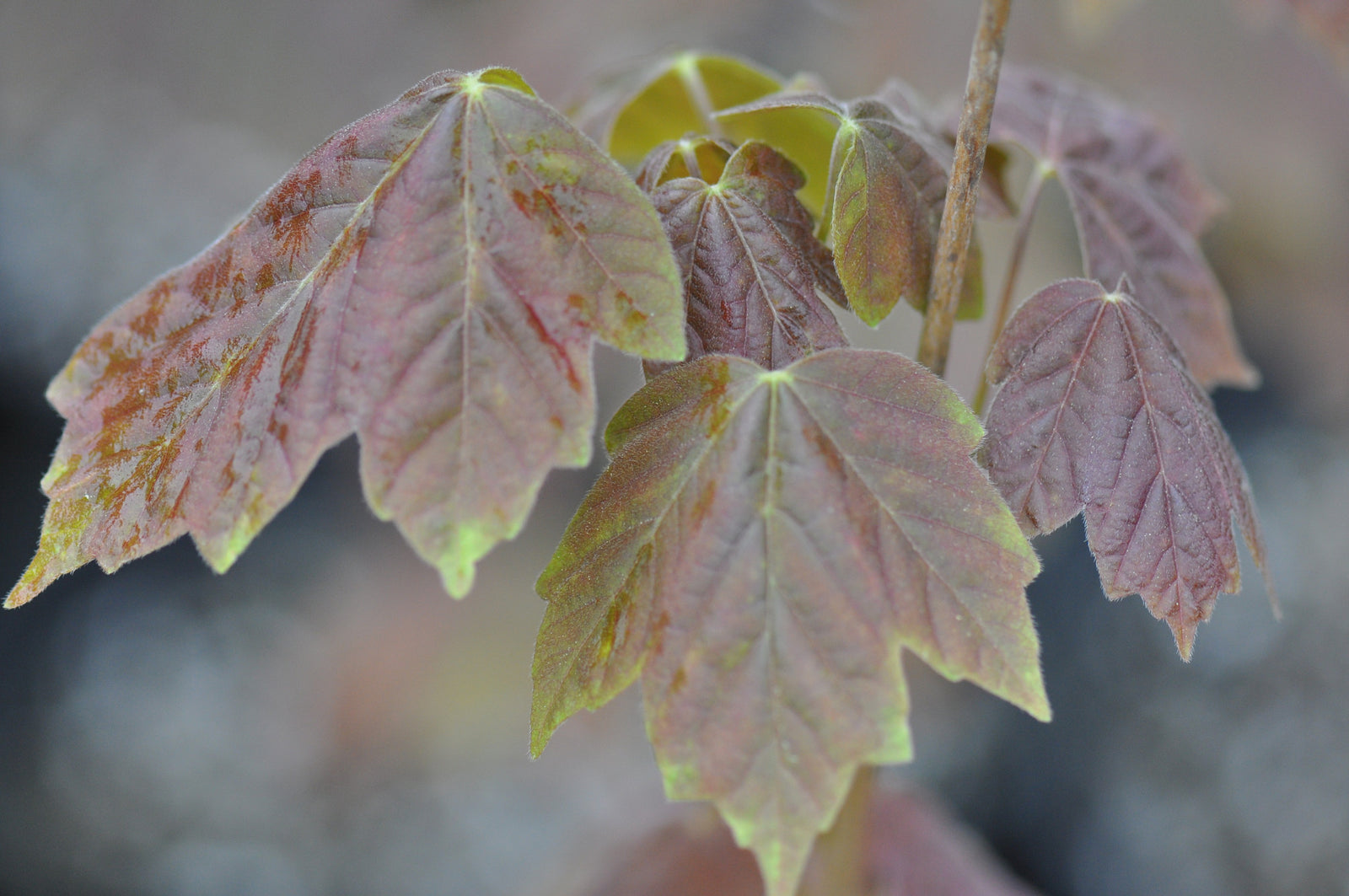 Attributes: Deciduous. Three lobed leaves that emerge orange-bronze. Later turning green with purple undersides. Crimson fall foliage.