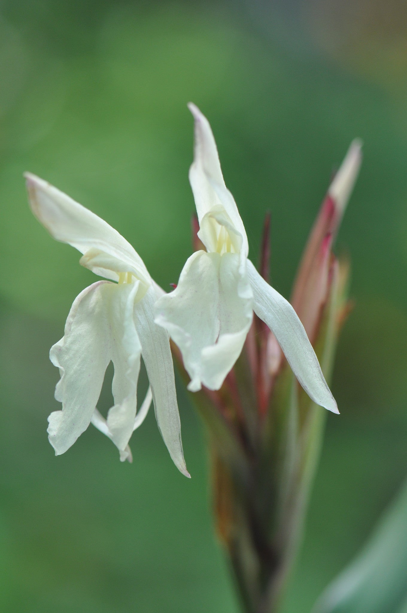 Attributes: Deciduous, Clumping. Reddish buds and bracts. Long blooming creamy white-yellowish orchid like flowers often with purple blotching on the lip. Thick fleshy corn like foliage. Flowers open in succession.