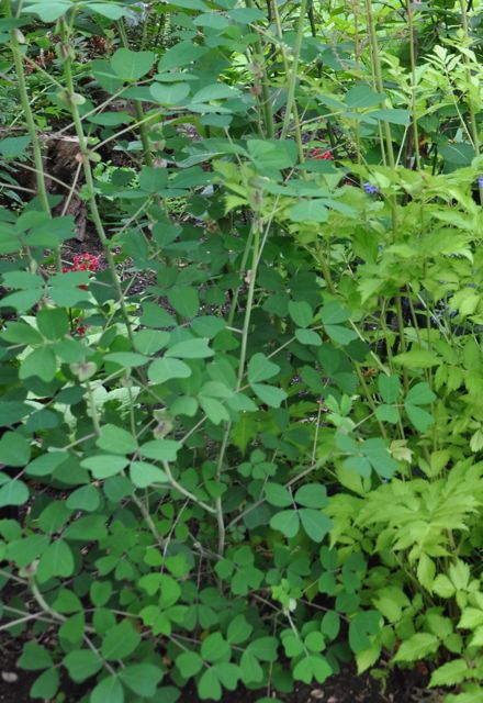 Attributes: Deciduous, Clumping. Dark purple new growth, turning olive green during the summer and yellow fall foliage. Numerous periwinkle blue flowers.