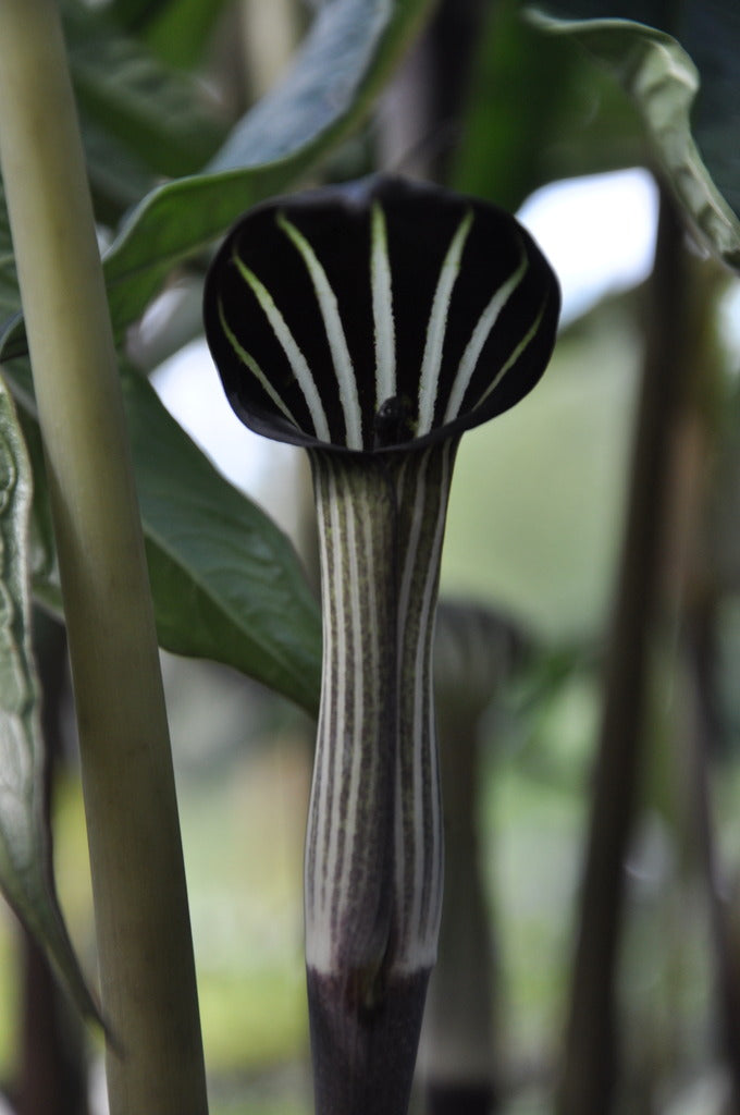 Attributes: Deciduous. Large trifoliate foliage. Dark purple-brown and white striped spathe.