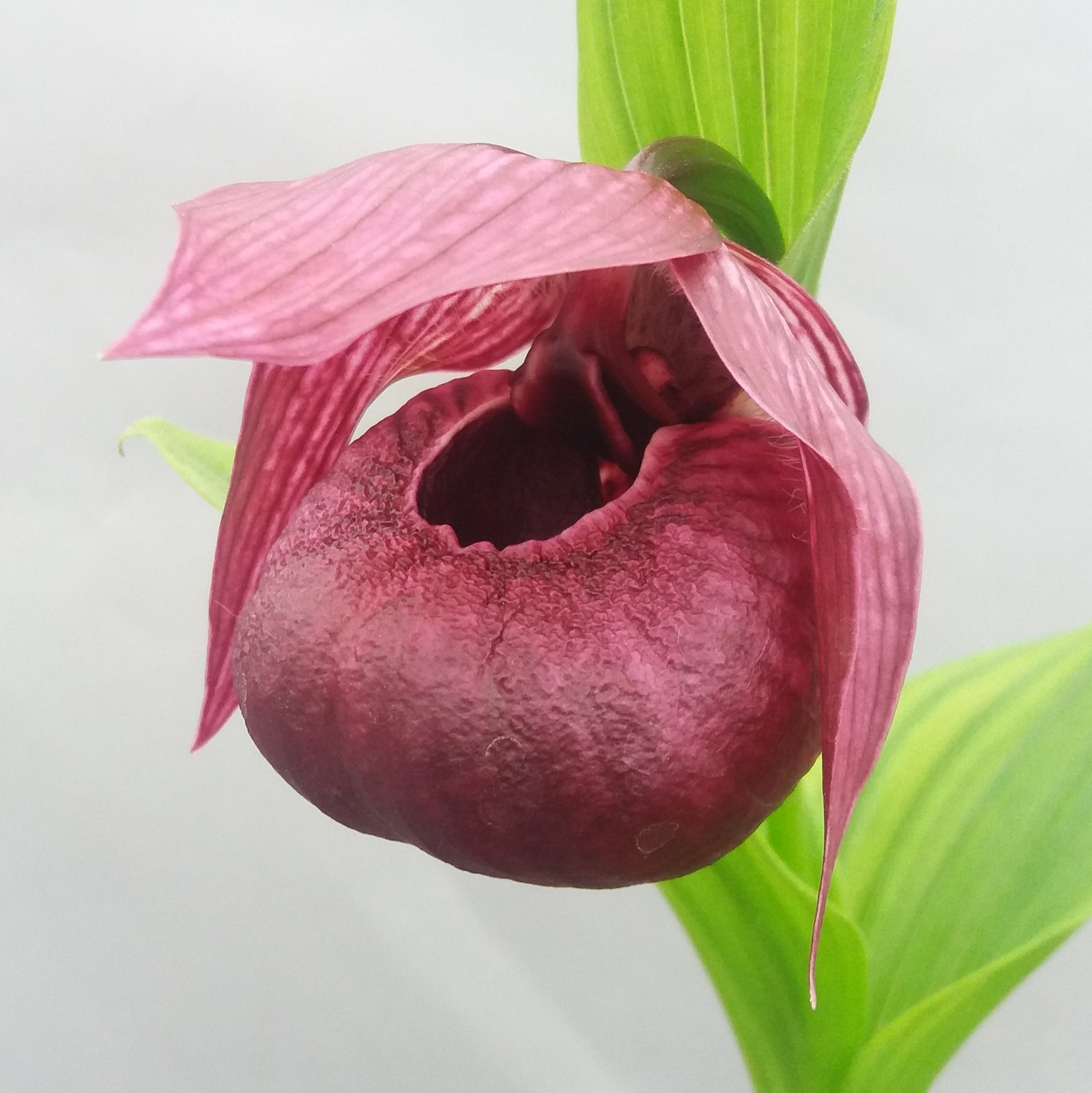 Attributes: Deciduous. Clumping. Large white and light burgundy mottled pouch and deep burgundy sepals.