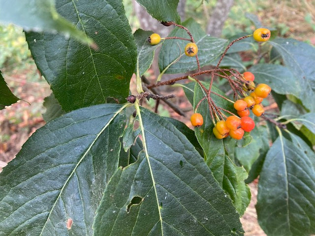 Attributes: Deciduous. Leaves are to 5 inches long and are lance-shaped to narrowly obovate with fine, sharp toothed margins. Bronze new growth with prominent ribbed veining. White flowers, orange-red fruit.