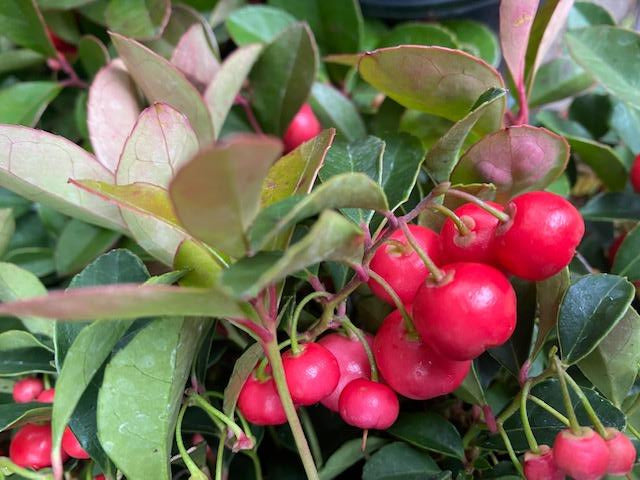 Attributes: Evergreen, glossy leathery leaves. Woody groundcover. White-pink urn shaped flowers. Red berries in Autumn.