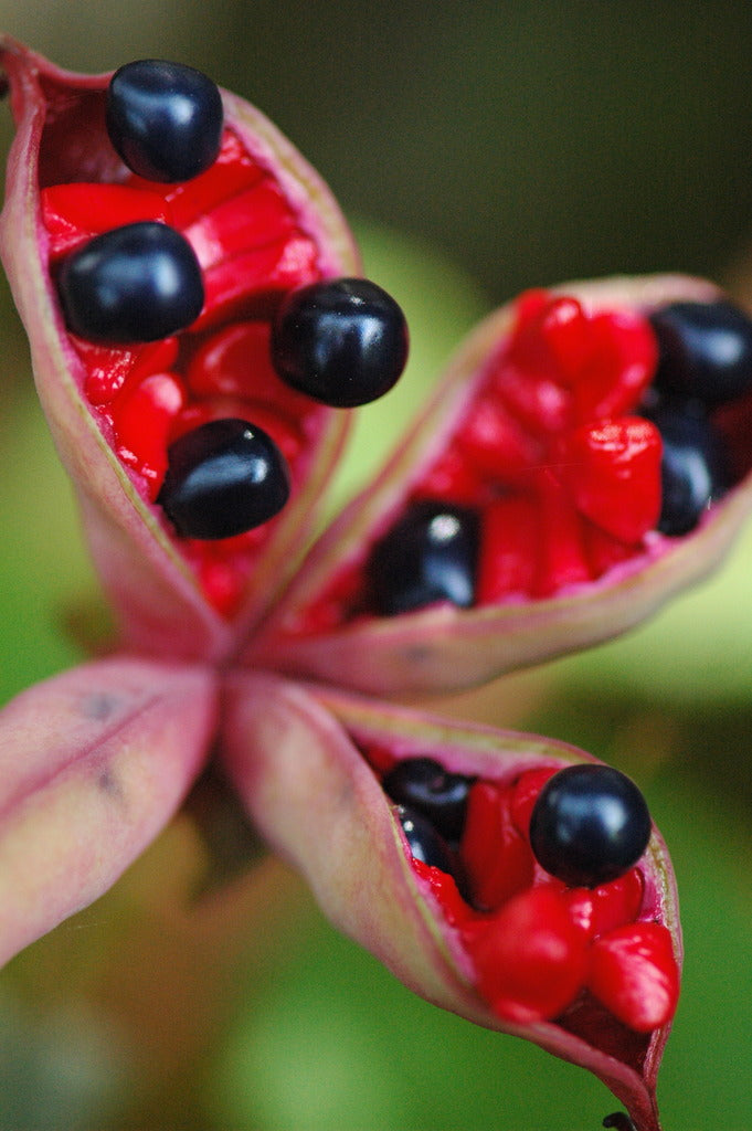 Attributes: Deciduous. Spring blooming. Red - pink new growth. Deep red underside of leaves. Large white flowers with yellow stamen. Large, bright red seed case with blue seeds.