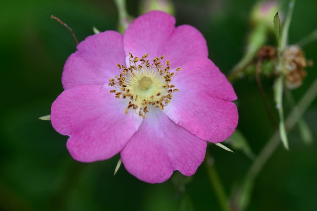 Attributes: Deciduous. Gray foliage with small, bright pink flowers. Red hips in fall.