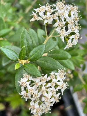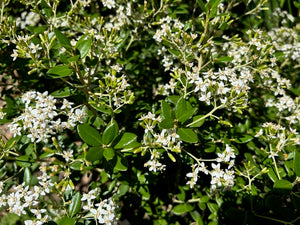 Attributes: Evergreen. Rounded shrub with glossy olive-green leaves with white undersides and numerous small white flowers. Light, flaky bark.